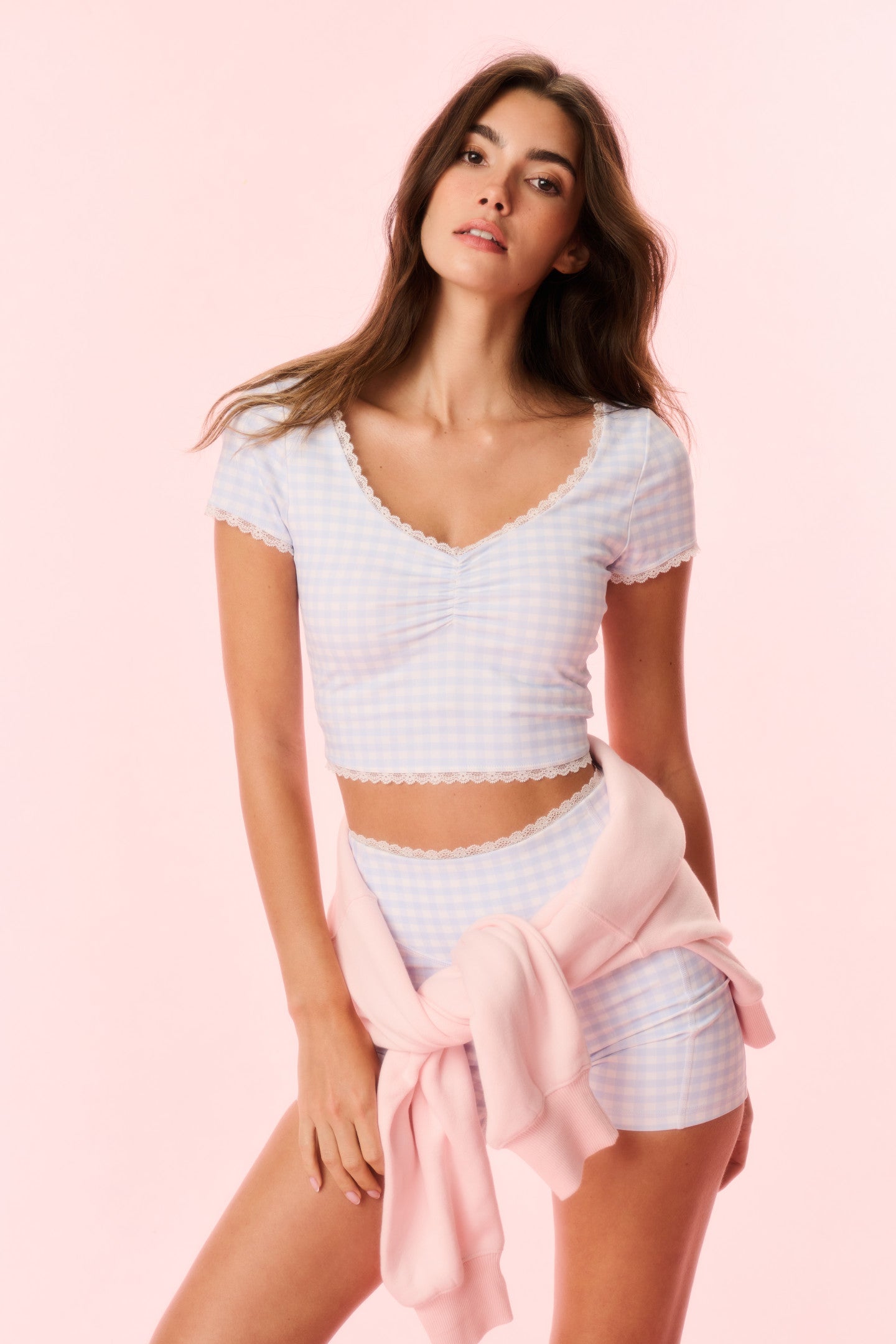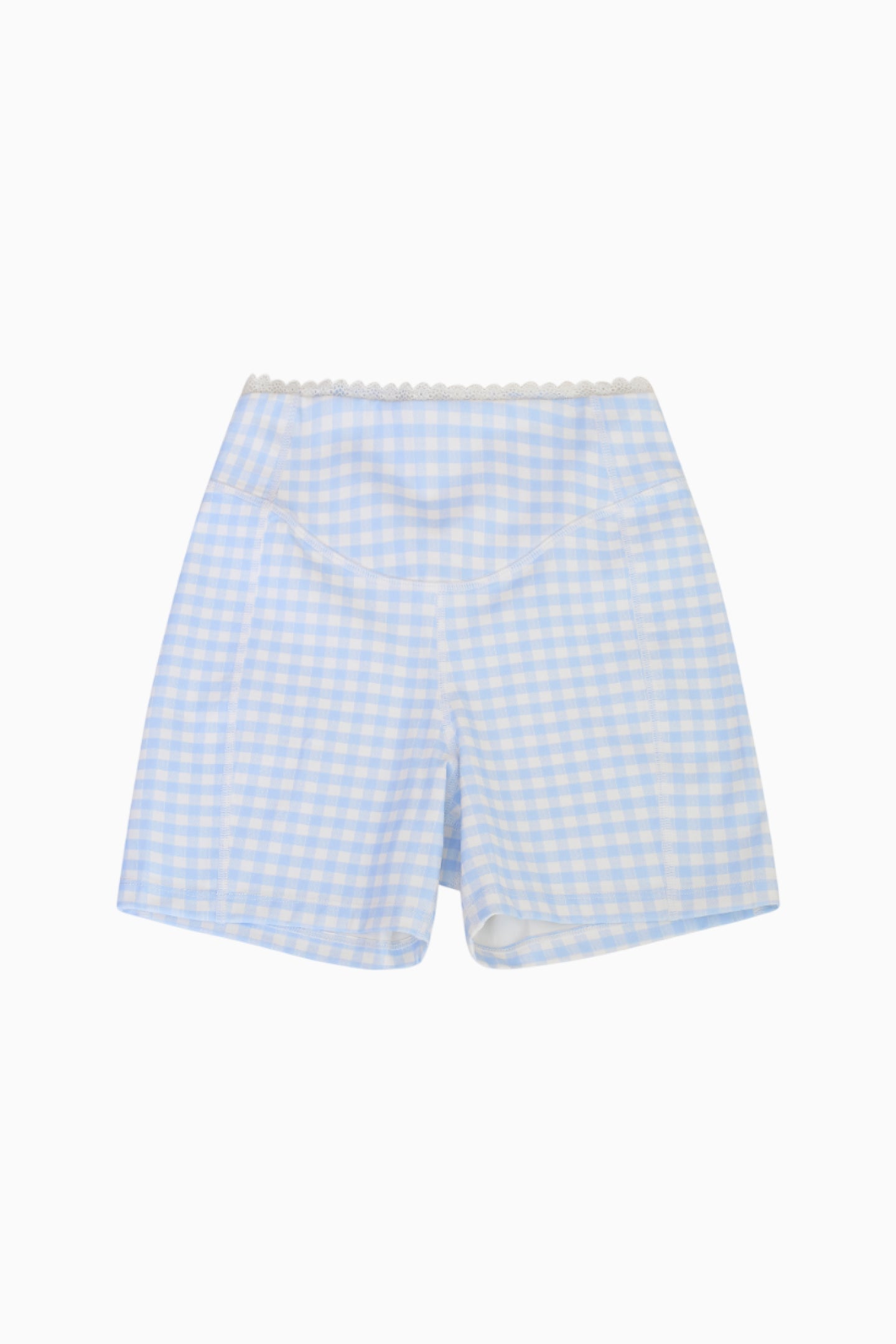 On the go in the Gia Biker Short. These easy active shorts are designed for low and high impact movement with our lightweight, breathable fabric. Arriving in a playful gingham print, the bottoms feature a lace trim for a feminine finish. Pair with the Kudura Top for a full set.