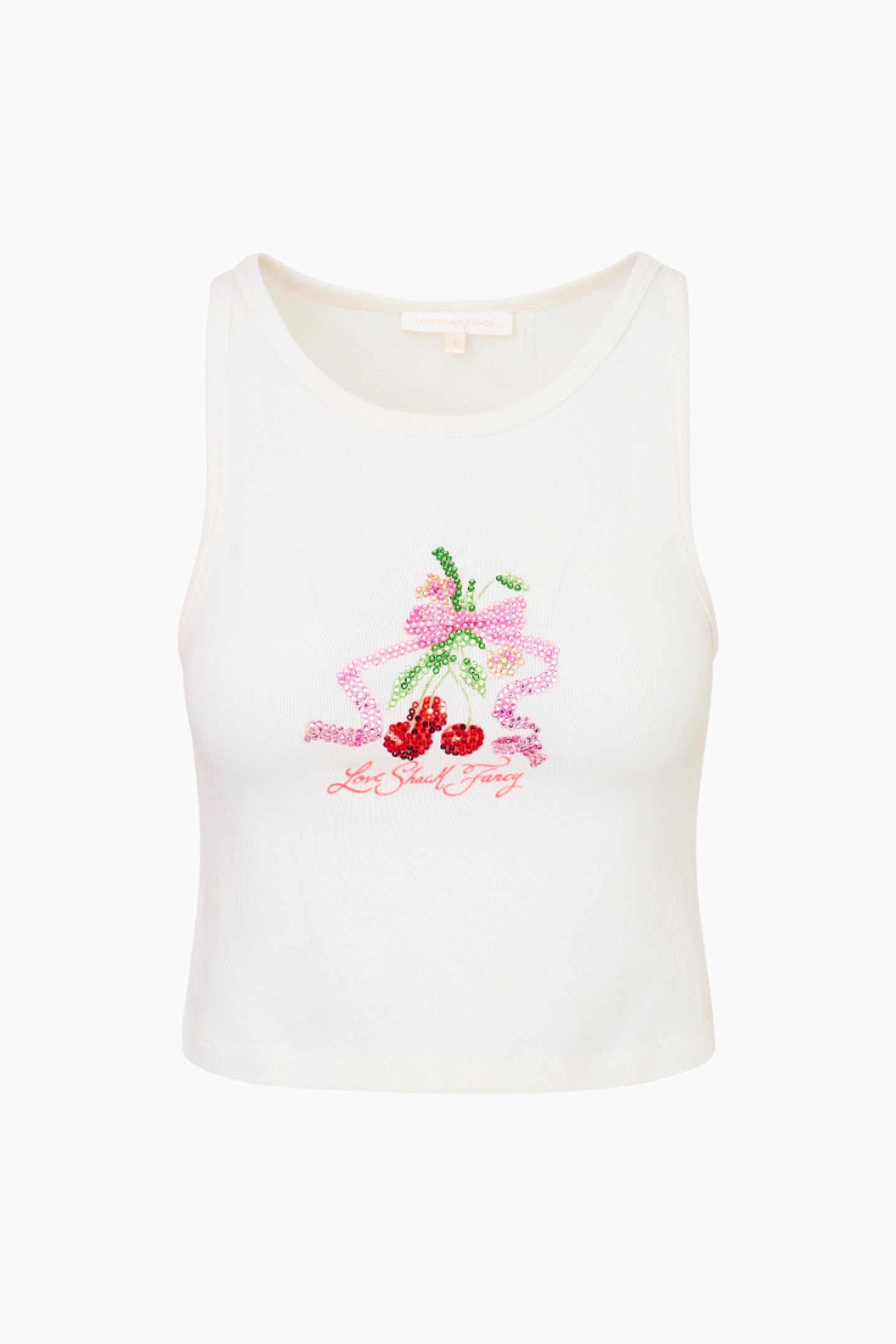 Introducing the Kaleen Tank as part of our America’s Sweetheart Cotton Collection. This flirty tank features a cherry graphic with LoveShackFancy on the front with tiny heart crystals for that extra shimmer. With a slim fit silhouette, this pretty piece a summer staple.