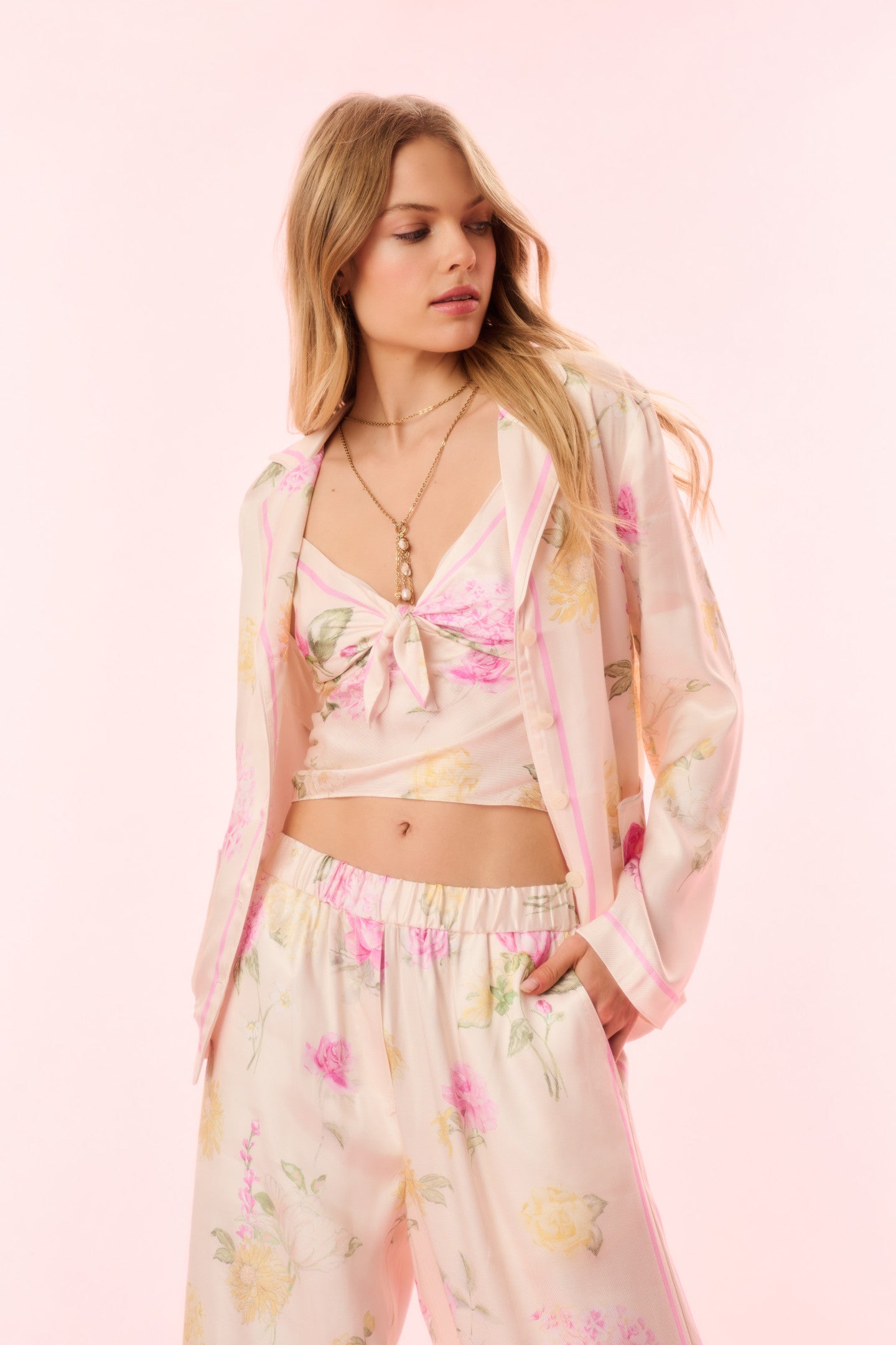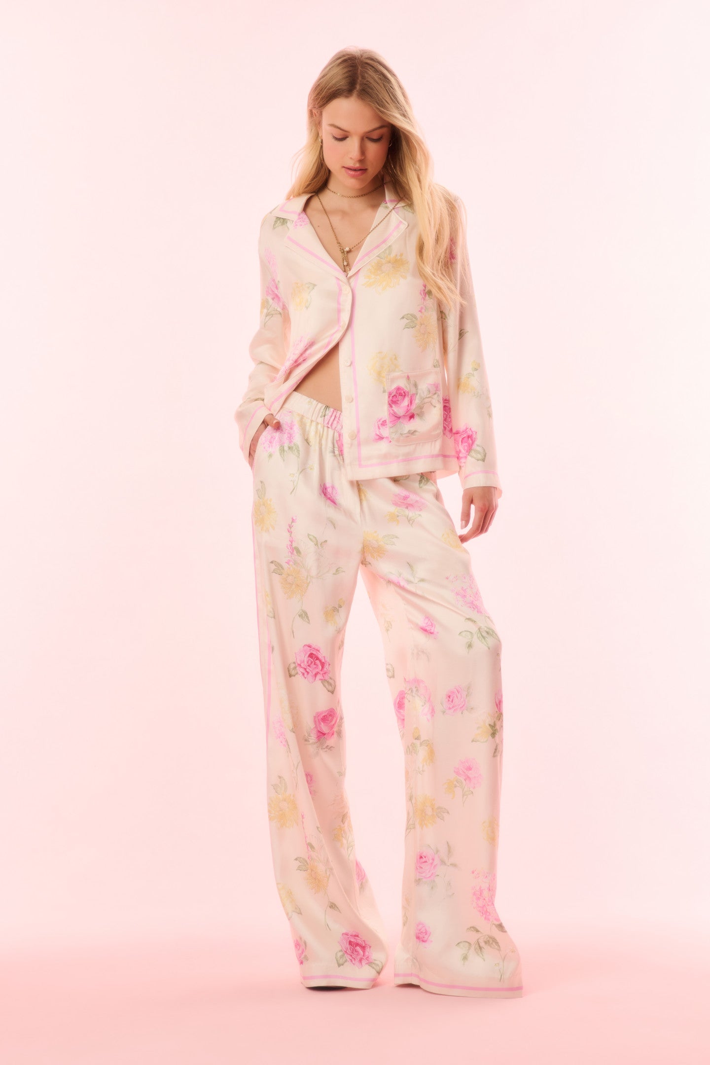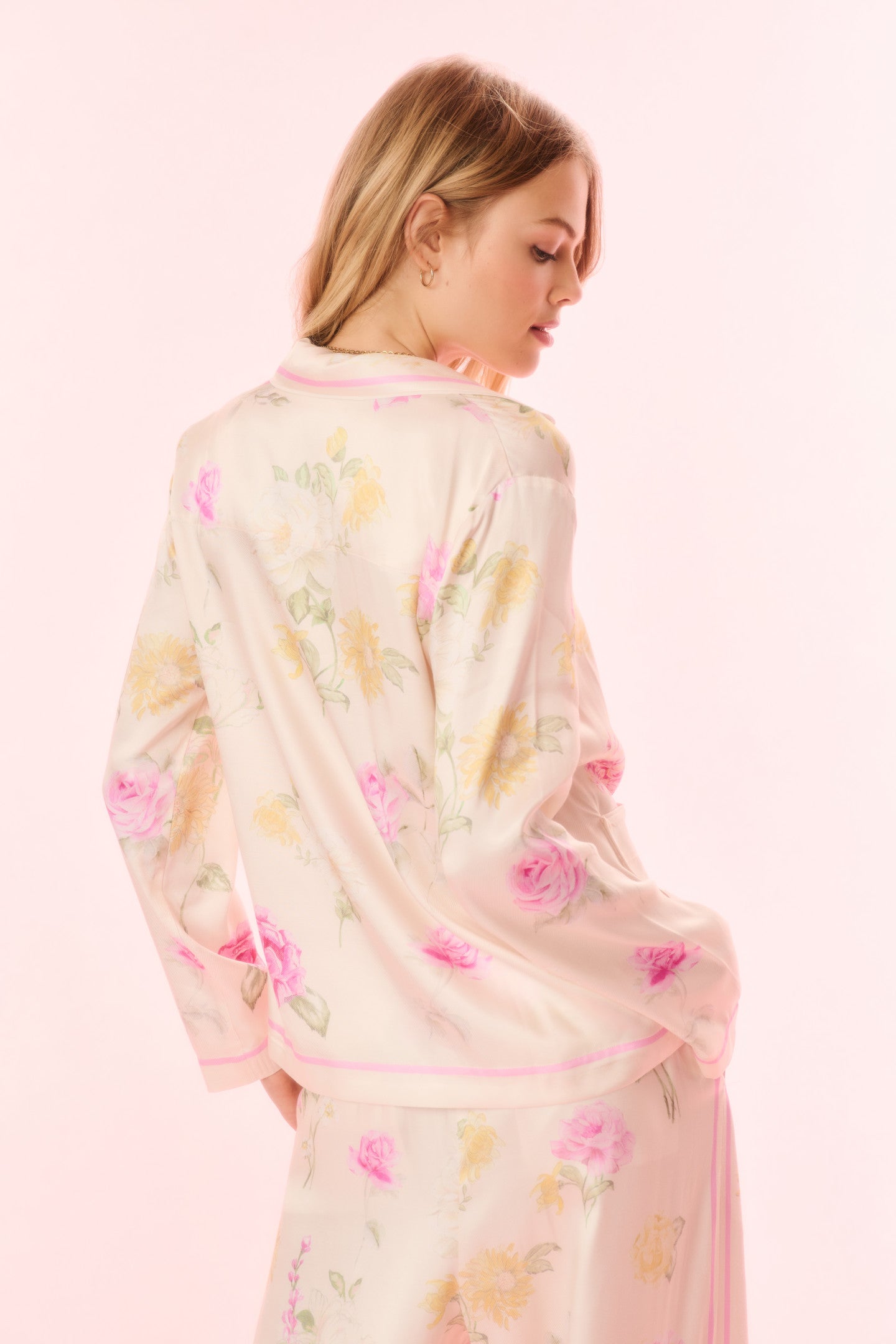 Introducing the Renetta Top. This elevated pajama top features an Italian-inspired print with hand-painted flowers in a romantic arrangement and stripes throughout. The loose  top begins with a camp collar, buttons down center front, long sleeves, and pockets at the waist area. Pair with the Helia Pant for a full set.
